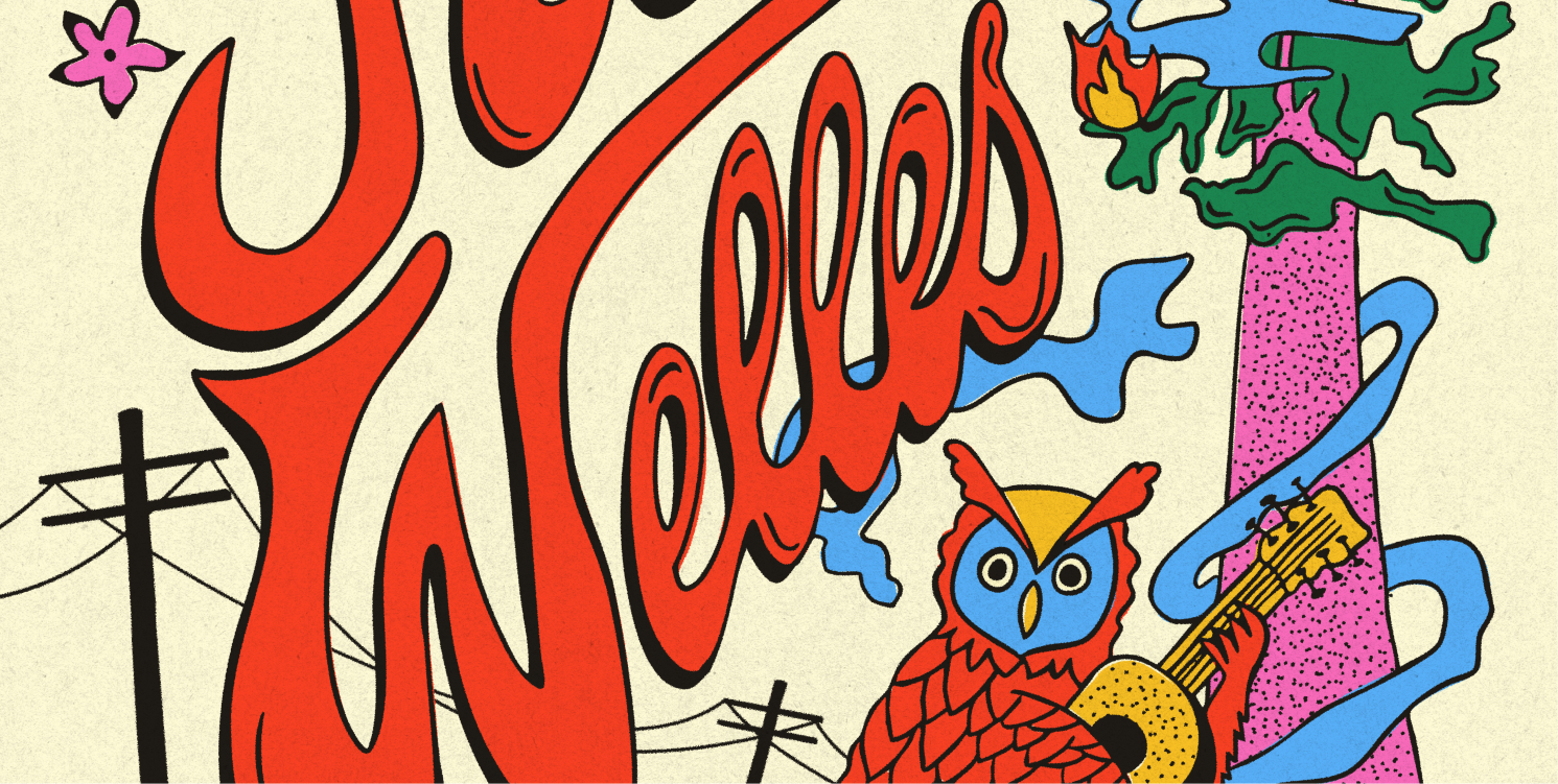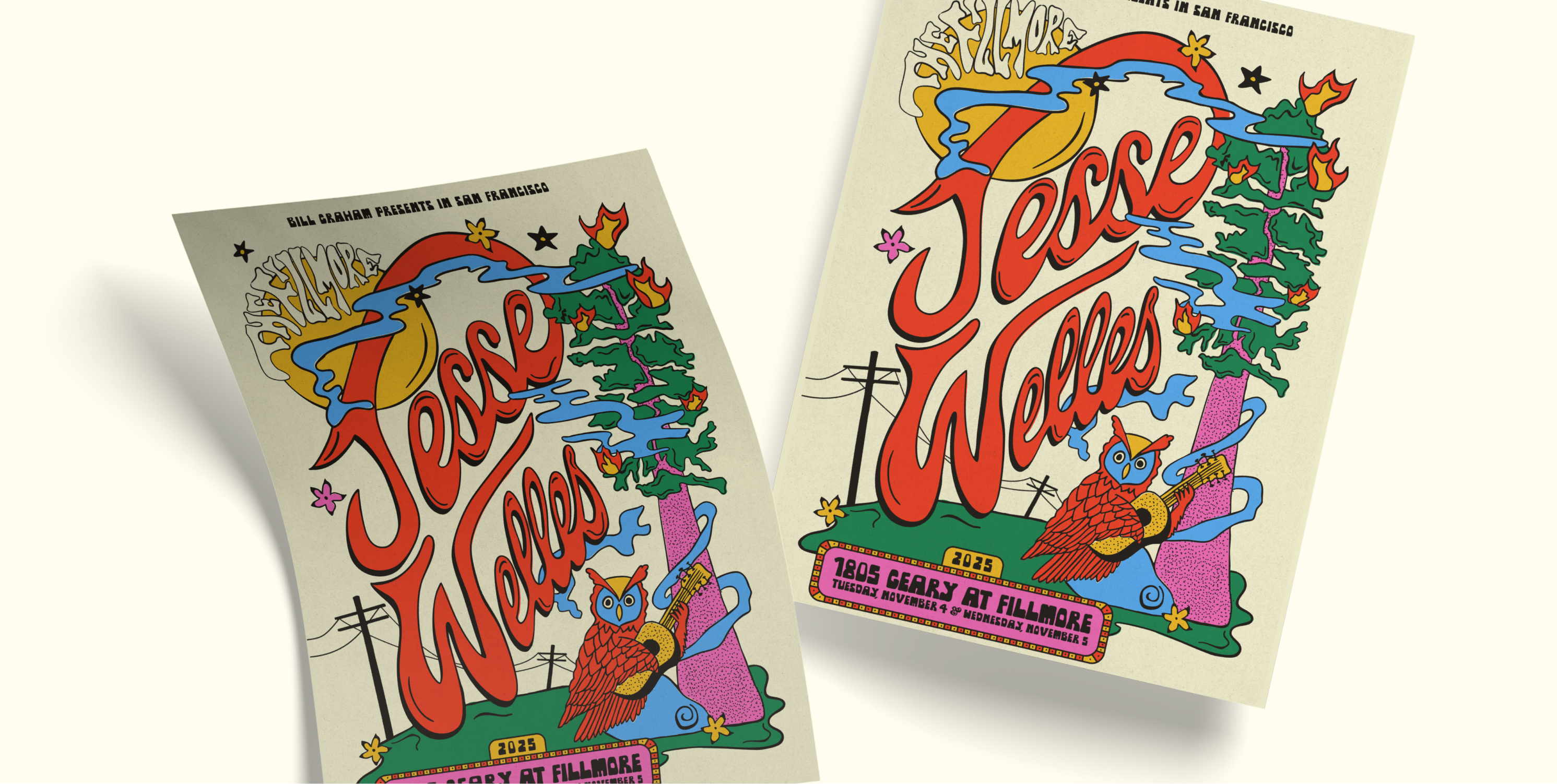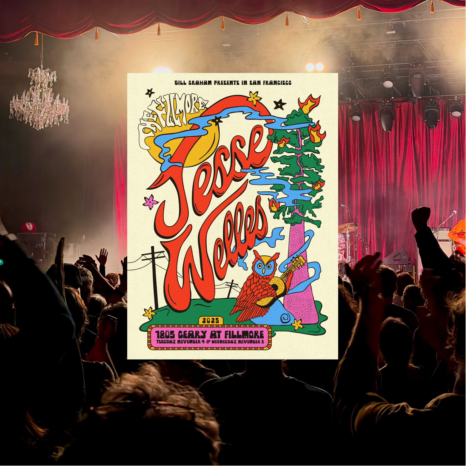 This is the official poster for Jesse Welles’ tour stop at The Fillmore in San Francisco. The venue has a long-running tradition of commissioning original show posters for bands including The Grateful Dead, Jefferson Airplane, Jimi Hendrix, and Nirvana.