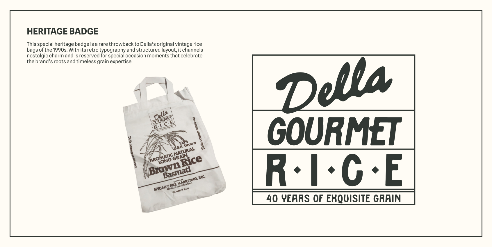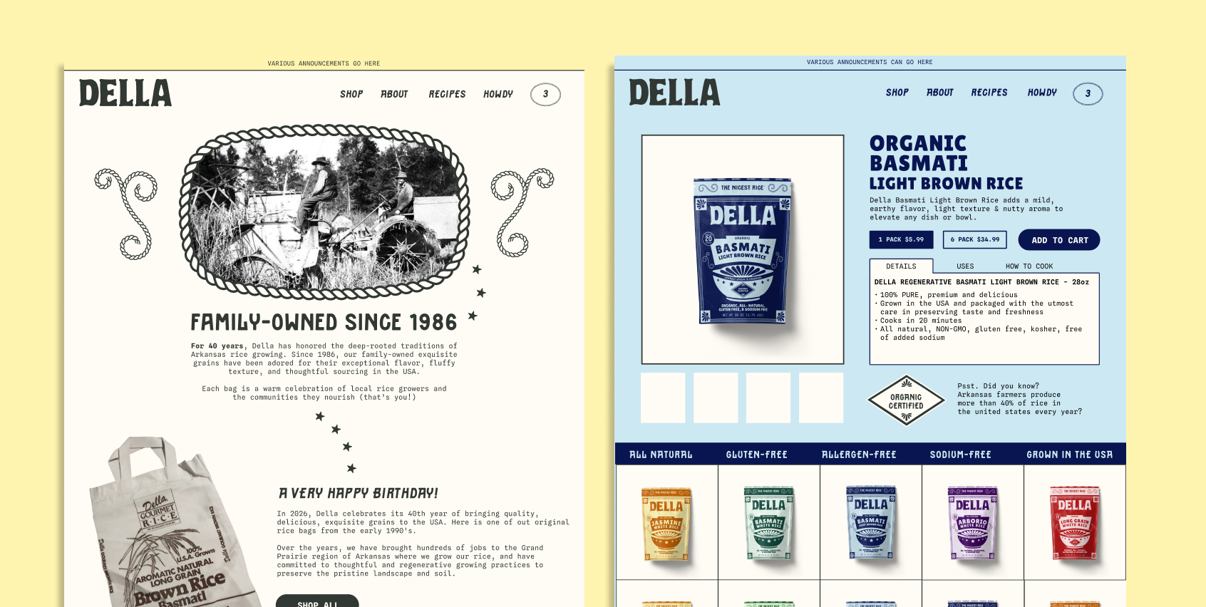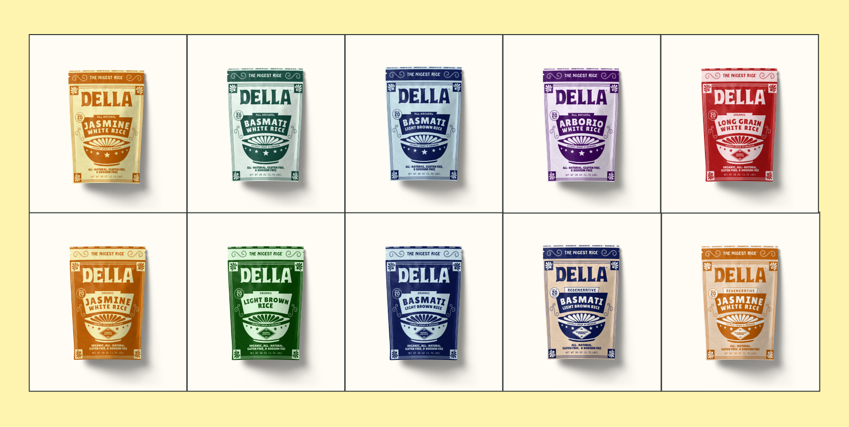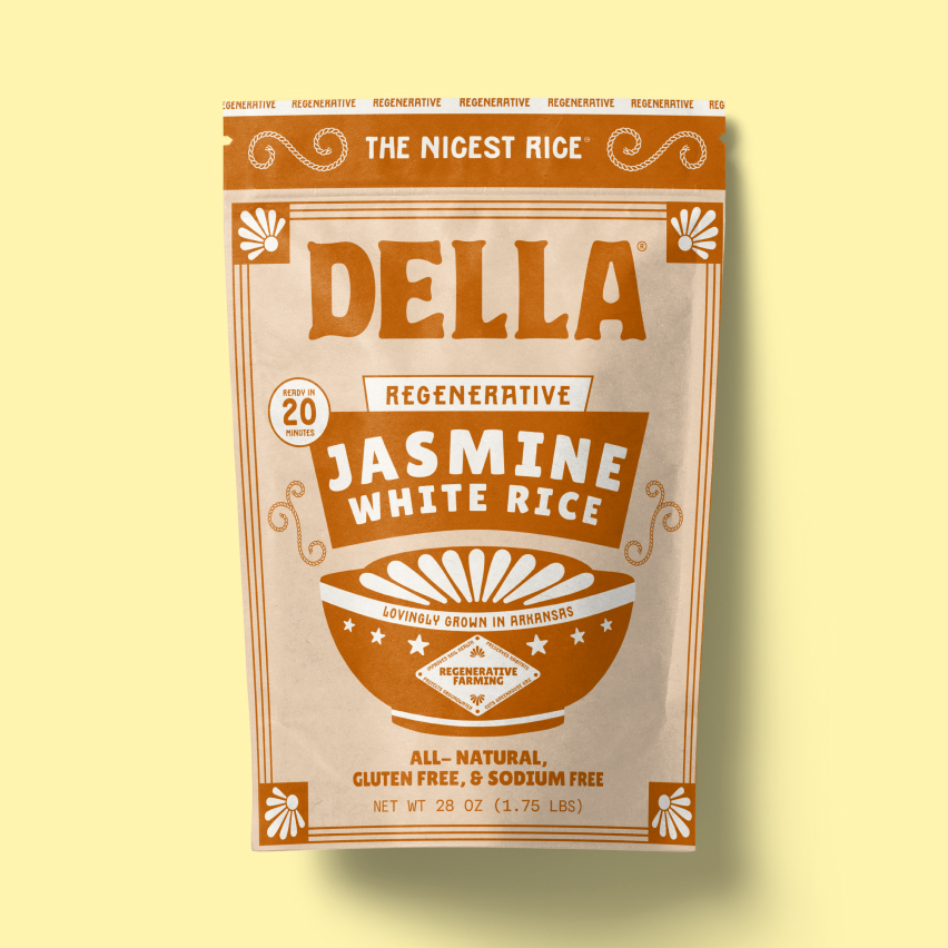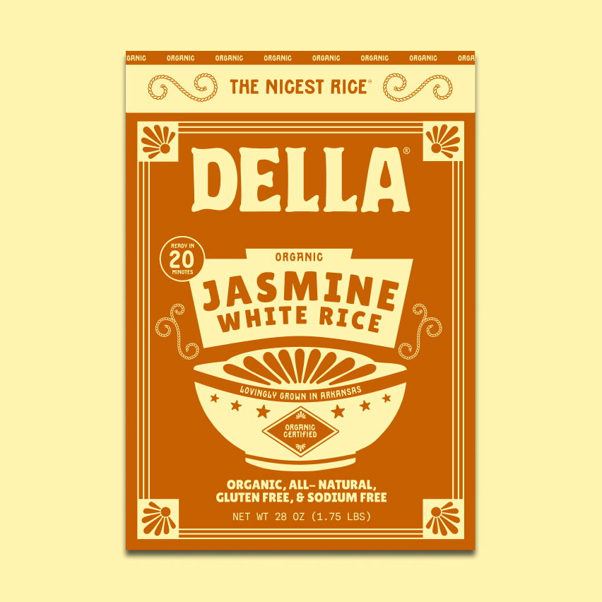 We gave Della Rice the slogan, 'The Nicest Rice', because it's delicious, fluffy, family-owned and domestically harvested with great care. These exquisite grains deserved a soulful and celebratory package to honor their legacy and their Arkansas roots.